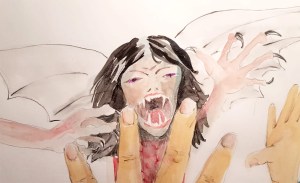 Aber so kam es nicht. Adam kroch aus Fränzis Lockenkopf hervor, schwang sich mit einer Haar-Liane auf ihre Nase und zog seine Flöte aus der Tasche. Noch kräftiger als zuvor blies er die Backen auf und brachte sehr laute, schräge Töne hervor. Seine Musik kam dem Singsang der Sirenen mächtig in die Quere. Sie ließen vor Schreck ihre Harfen fallen und hielten sich mit beiden Pfoten fest die Ohren zu. Ihre Gesichter verwandelten sich augenblicklich. An die Stelle der puppenartigen Gefälligkeit kamen ihre hässlichen Seiten zum Vorschein. In den Mäulern bildeten sich Vampirzähne. Herzlos starrten ihre Glubschaugen ins Leere. Bei jedem Ton aus Adams Flöte mussten sie sich schütteln. Kurz: Adams Musik wurden ihnen unerträglich. Sie mussten sich geschlagen geben und suchten das Weite.