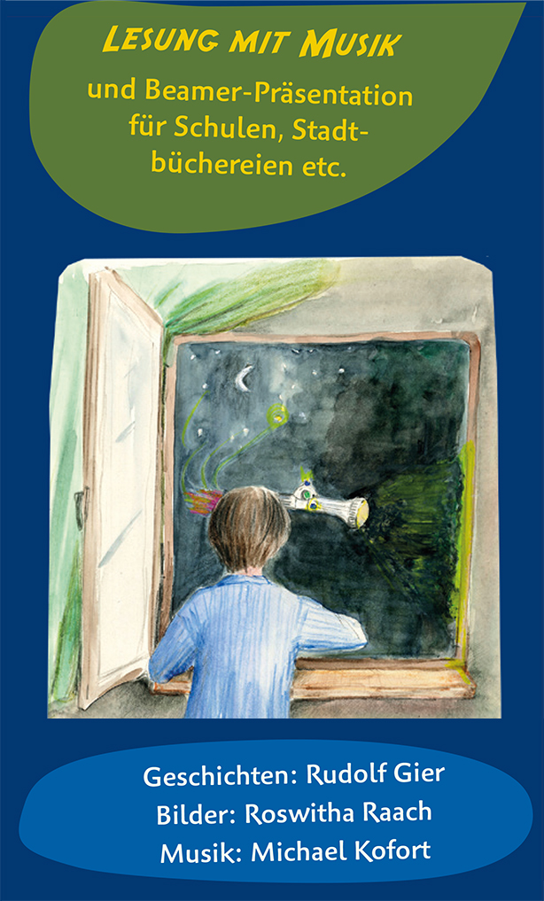 Rudolf Gier kommt in die Schule oder Stadtbücherei und stellt sein Buch Die Stimme aus dem Koffer vor. Er liest eine oder zwei Geschichten („Besuch nach Mitternacht“) und tauscht sich mit den Kindern darüber aus. Um eine angemessene Atmosphäre zu gewährleisten, sollen pro Veranstaltung maximal 3 Klassen bzw. 75 Kinder teilnehmen. Michael Kofort begleitet die Lesung musikalisch mit Handpan, Gitarre und anderen Instrumenten. Außerdem werden die Buchillustrationen der Künstlerin Roswitha Raach per Beamer oder Großbildschirm eingeblendet. So entsteht ein spannendes Erlebnis, das die Freude an Büchern und Geschichten und die Leselust wecken soll.