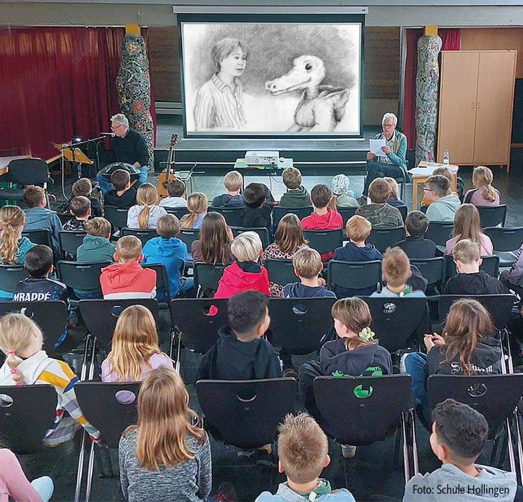 Sehr gut kamen die Aktionen zum Tag des Vorlesens bei den Kindern der Grundschule Hollingen an. Rudolf Gier stellte sein neues Kinderbuch Die Stimme aus dem Koffer vor. Begleitet wurde er dabei von Michael Kofort mit Handpan und anderen Instrumenten. Rudolf Gier möchte mit der multimedialen Lesung nicht nur sein Buch bekannt machen, sondern generell die Freude an Büchern und Geschichten und die Leselust der Kinder wecken. „Insofern passte die Veranstaltung ausgezeichnet zum Tag des Vorlesens“, meinte die Schulleiterin Carla Dobenecker.