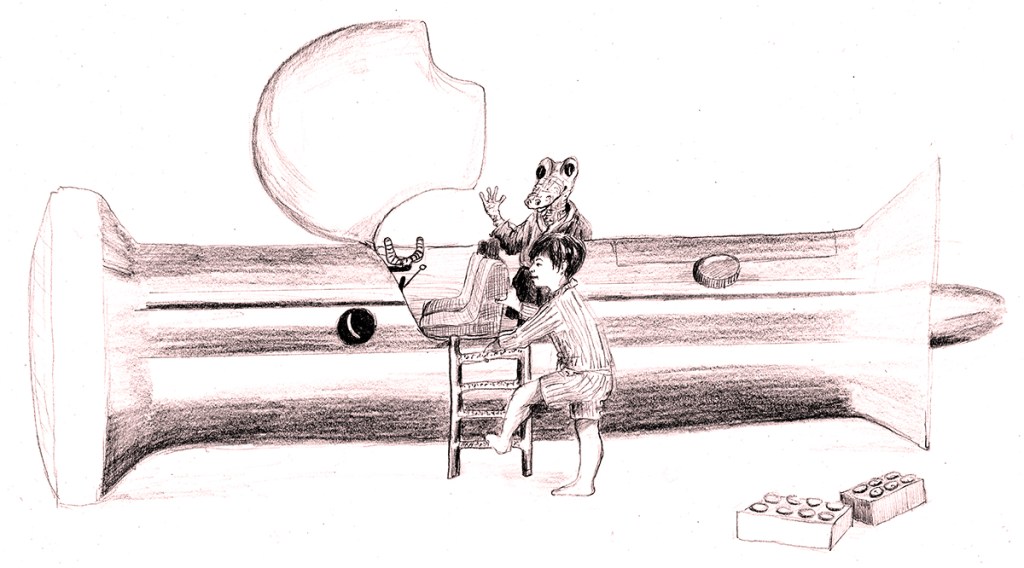 Als Jakob mitten in der Nacht aufwacht, traut er seinen Augen nicht. Ein kleines Raumschiff kommt in sein Zimmer geflogen, und ein Außerirdischer mit Krokodilskopf steigt aus. Er heißt Krixilan und erweist sich schnell als freundlicher Besucher. Zu gern möchte sich Jakob das Ufo von innen ansehen. Er lässt sich von Krixilan mit einem Lilliputisierer zu einem Winzling verkleinern und bricht mit dem freundlichen Alien zu einer abenteuerlichen Reise durch die Wohnung auf. Sie machen einen Abstecher zu den schlafenden Eltern. Wie Jakob hat auch der Außerirdische Probleme mit seinen Eltern, und die beiden haben sich eine Menge zu erzählen. „Besuch nach Mitternacht“ ist eine der zehn magischen Geschichten aus Die Stimme aus dem Koffer und steht im Mittelpunkt der Veranstaltung.