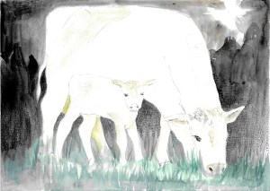 Kaum hatte Jakob das Licht ausgemacht, schlief er ein. Um Mitternacht ertönte schrilles Geklingel. Jakob knipste die Nachttischlampe an, machte den Wecker aus und rieb sich die Augen. Er stand auf, ging in die Küche und schaute aus dem Fenster. Am Himmel leuchteten Tausende von Sternen. Auf der Wiese war es allerdings fast schwarz. Die zehn Kühe, die irgendwo sein mussten, waren wie vom Erdboden verschluckt. Nur eine einzige Kuh entdeckte Jakob. Sie hatte weißes, leuchtendes Fell und funkelnde Augen. Aufrecht stand sie da. Zufrieden wandte sie ihren Kopf herum und blickte nach unten.